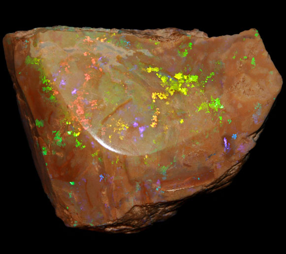 Solid Crystal opal, in the best crystal the stone is transparent, but harbouring brilliant flashes of colour throughout. Stones with slight milkiness, but brilliant colour are some what reduced in value. This is a popular type of opal, found at Mintabi, South Australia, and White Cliffs and Lighting Ridge in New South Wales.