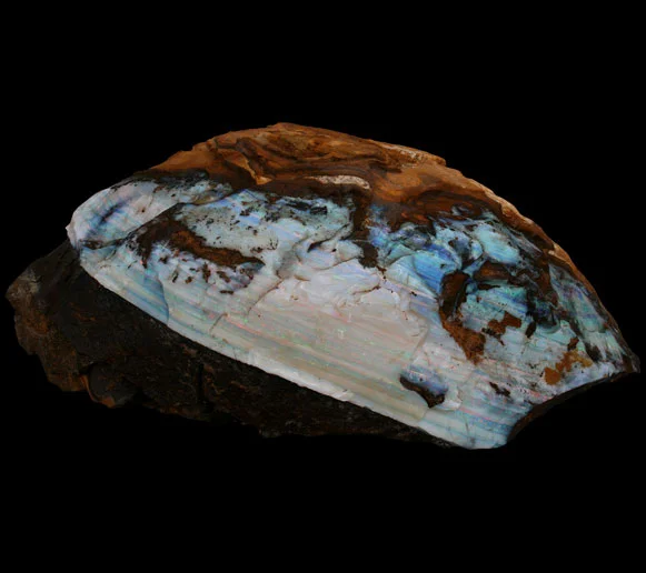 Opal occurs over thousands of square kms in western Queensland, where it is found as narrow veins and impregnation in iron rich sandstone. The naturally dark host rock highlights the colour which can be very vibrant and striking. The price range for Boulder opal is from $20 per carat to $1000 per carat. Almost invariably, boulder opal, as with all high quality opal, is cut to a freeform shape to maximaize the use of the natural material and optimize the play of colour.